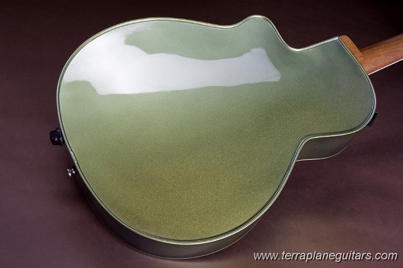 Note antique bakelite ham radio knob, which functions for pickup panning. This feature was specified on Arlen Roth's personal Terraplane. Rear view displays finish color variation from gold to green.